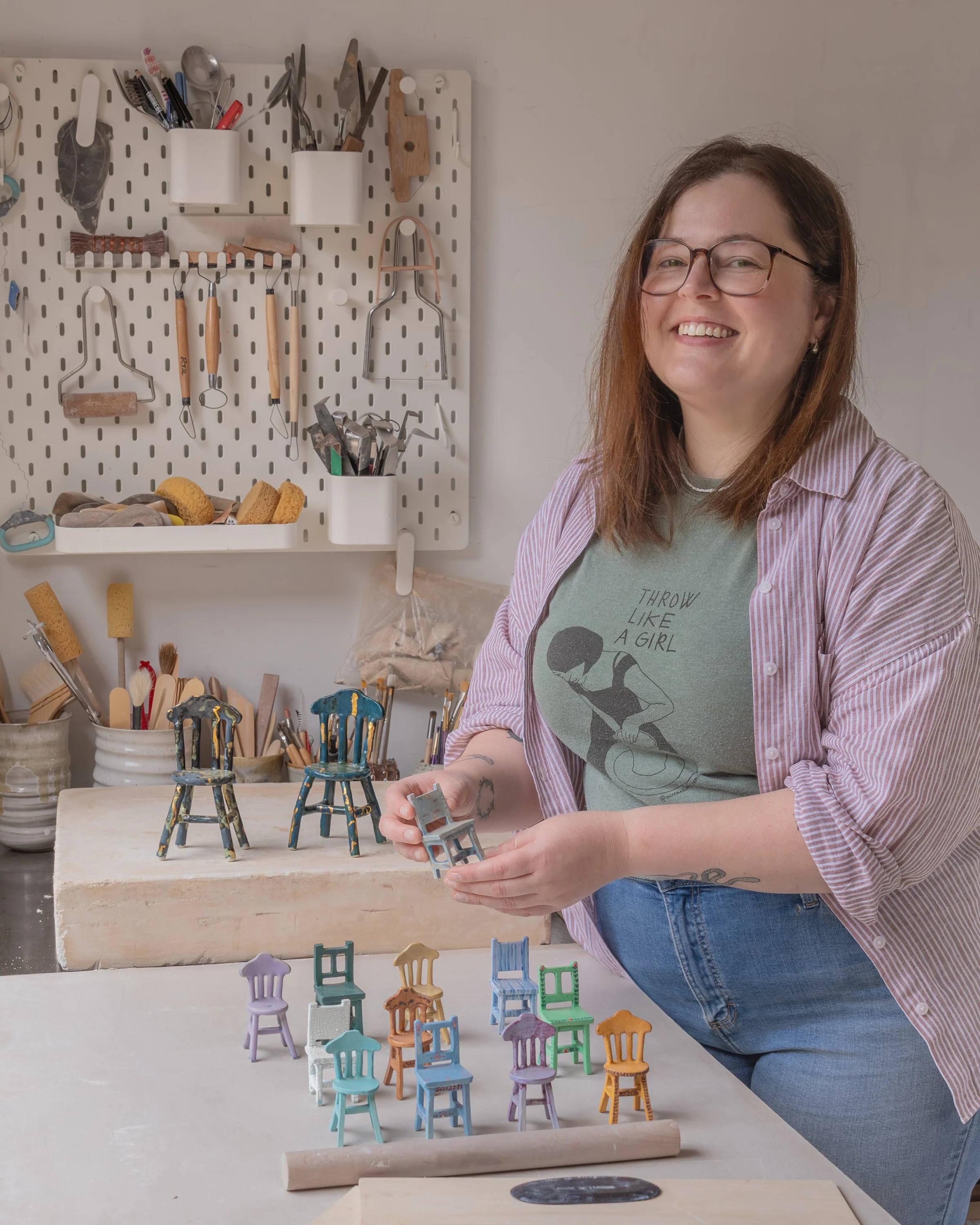 Emily’s work is informed by material exploration and an investigation of object interaction to create a sense of place. Our innate need to attach meaning and sentimentality to objects continues to fascinate Emily and the connection to community through clay drives her practice. Her current focus is on constructing miniature chair sculptures that evoke nostalgia and celebrate craft based art forms. Challenging the traditional value we place on everyday objects by championing form over function.